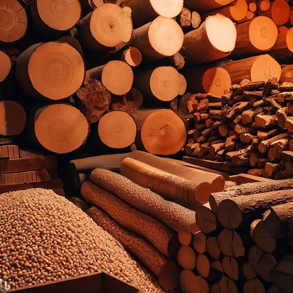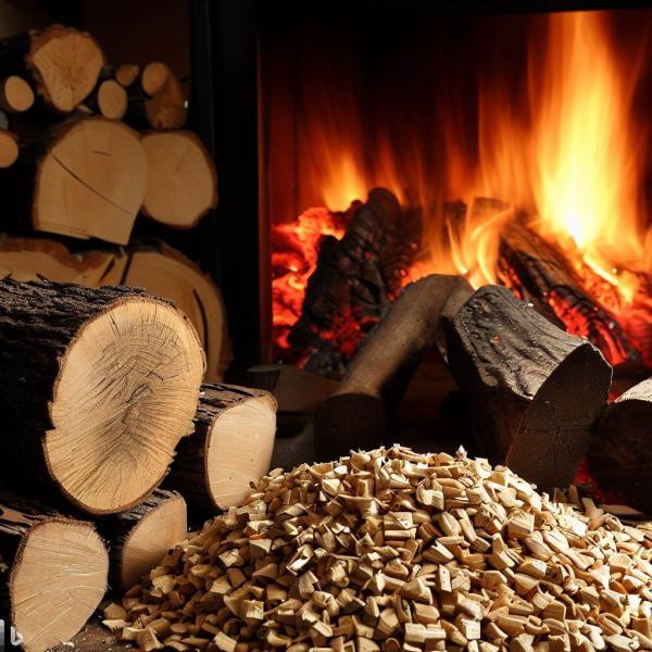 Wooden logs, chips, and pellets in a log store